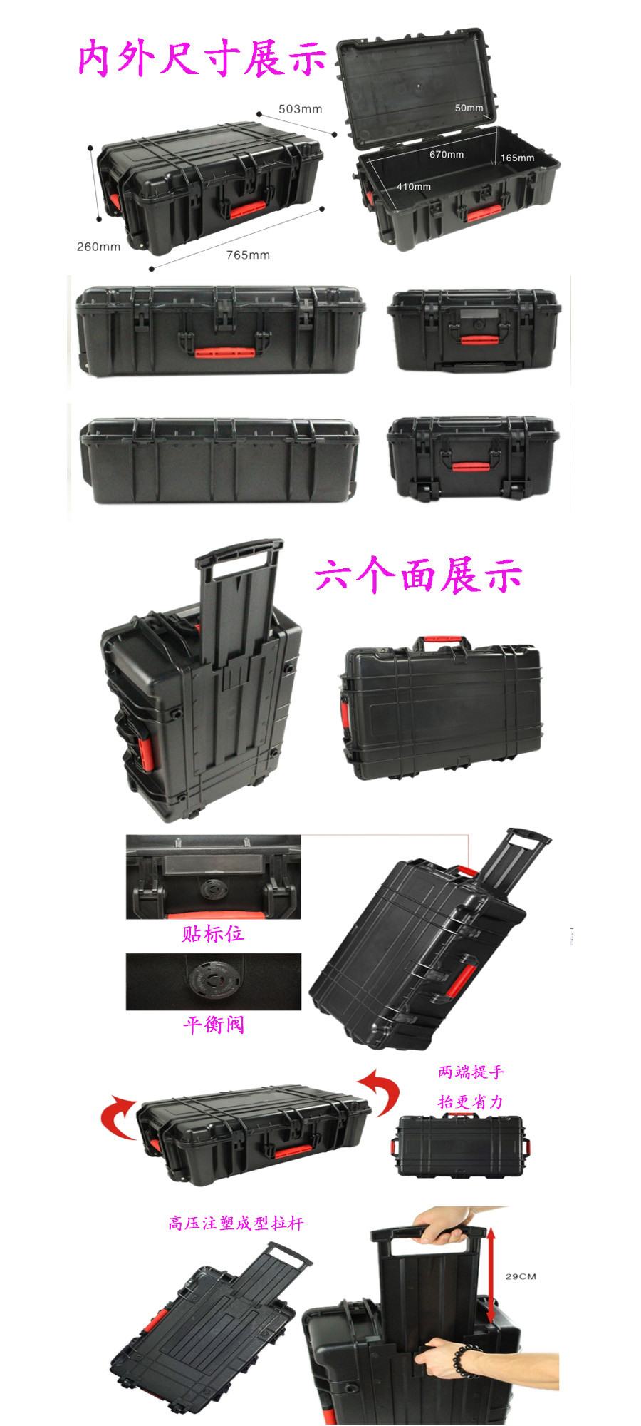 簡(jiǎn)要說明:廣泛用于傳媒、公安、消防、軍隊(duì)、航空、戶外攝影、野外考察、科學(xué)探測(cè)等眾多領(lǐng)域的高端儀器、儀表。具有高強(qiáng)度、高抗壓沖擊、防潮、絕對(duì)密封、防塵、防水等特點(diǎn)。產(chǎn)品材質(zhì):ABS原料,箱體采用高抗沖擊的高分子聚合材料一體注塑成型,密封采用扁型彈性發(fā)泡密封橡膠條,確保防水氣密,所有較軸均采用不銹鋼材質(zhì)。